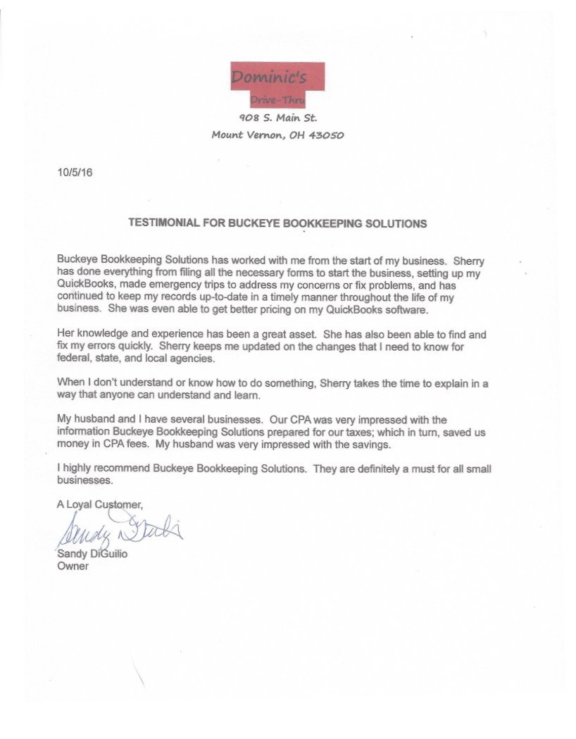 ![]() December 16, 2016 Buckeye Bookkeeping Solutions has saved our company a significant amount of expense in bookkeeping services, has helped simplify our billing process, and has reduced our stress level by managing the accounting aspect of our small business. We no longer worry about tax deadlines, Federal, State payroll reports, quarterly reports, bank reconciliation's, etc. Our information is always completed in detail and in a timely manner. Sherry has demonstrated never ending patience with me, taking time to guide me through our new accounting software (which by her recommendation has reduced my customer billing time in half), and to recommend additional time-saving services. She is always professional, friendly, informative and prompt in returning telephone calls or emails. Sherry has helped to educate me by providing reference to areas regarding possible additional tax deductions and updates to changes in regulations that could affect our business. Our company is proud to recommend Sherry Wilson to any